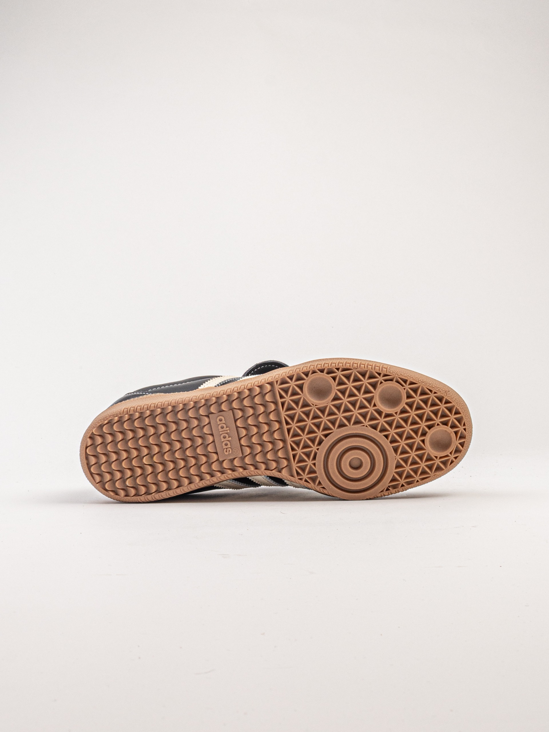 The Adidas Samba LT in Core Black / Cream White / Gum revives the classic football-inspired silhouette with vintage flair. It features a sleek black leather upper contrasted by cream white 3-Stripes and heel tab, finished with a timeless gum rubber sole. The exaggerated fold-over tongue nods to the Samba’s pitch heritage, while the leather construction and synthetic lining ensure comfort and everyday durability.