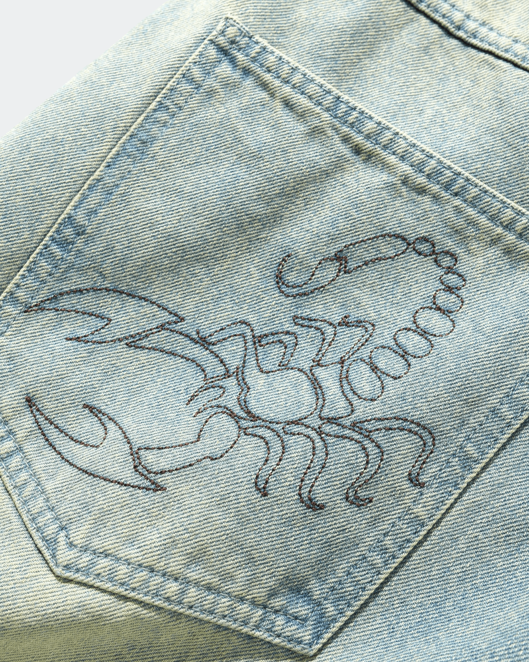 The Butter Goods Scorpion Denim Shorts in Tinted Light Blue deliver a relaxed, skate-inspired silhouette rooted in classic 90s denim styling. Crafted from durable 100% cotton, these baggy-fit shorts are designed for comfort and unrestricted movement, sitting just below the knee. Functional features like a traditional 5-pocket construction, reinforced rivets, and an adjustable waistband with belt loops and internal drawstring ensure everyday practicality. Finished with embroidered scorpion graphics on the back pockets and a washed light blue tint, they offer a vintage-inspired look with bold signature detailing.