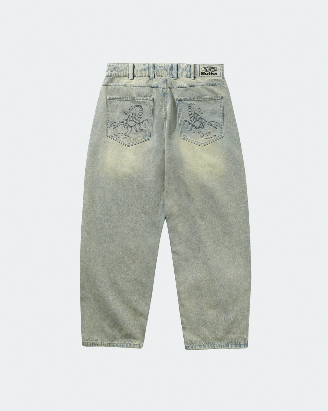 The Butter Goods Scorpion Stitch Denim delivers classic skate denim styling with bold graphic detailing. Constructed from durable 100% cotton denim, this silhouette features a relaxed, baggy fit designed for comfort and unrestricted movement. Inspired by 90s skate culture, it incorporates a traditional 5-pocket construction with reinforced rivets and an adjustable waistband with belt loops and internal drawstring. The standout detail comes from the embroidered scorpion graphic on the back pockets, adding a signature Butter Goods touch. Finished in a Tinted Light Blue wash, it offers a worn-in, vintage-inspired look perfect for everyday wear.