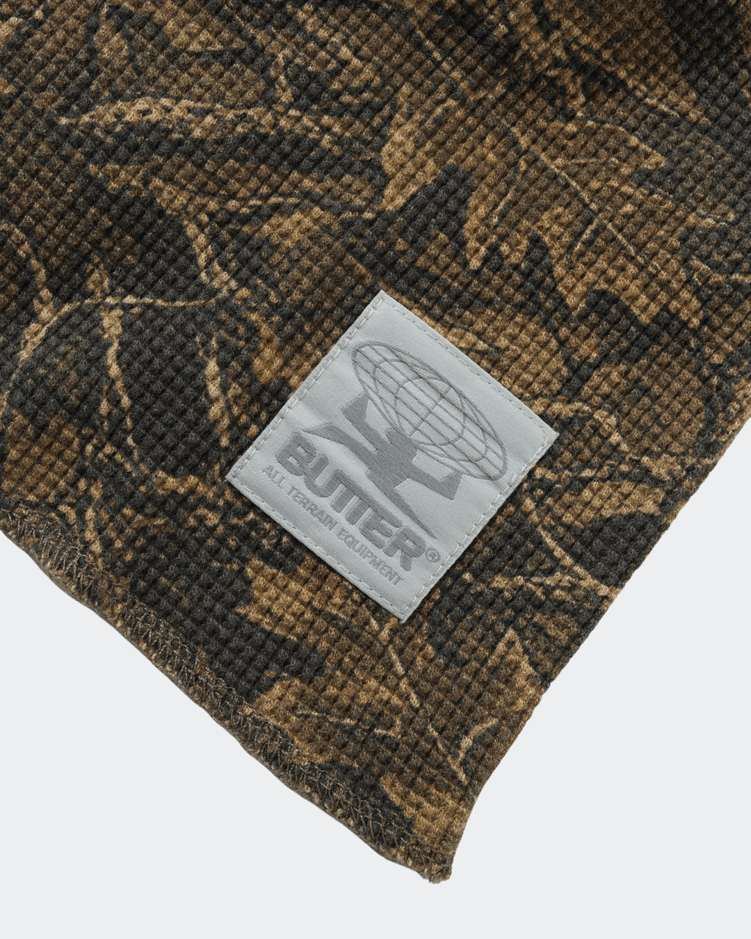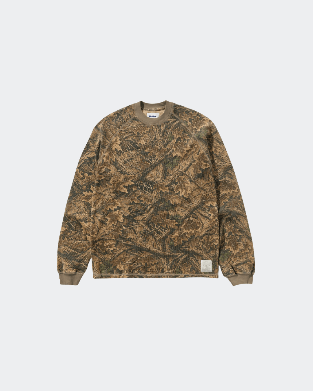 The Butter Goods Waffle L/S Top in Forest Camo blends classic thermal-inspired construction with bold skate-driven styling. Crafted from heavyweight 260gsm cotton waffle fabric, it offers a textured feel that enhances both warmth and breathability, making it ideal for layering or standalone wear. The relaxed silhouette with raglan sleeves ensures comfort and mobility, while ribbed cuffs and a structured crewneck maintain shape. Finished with an all-over Forest Camo pattern, it delivers a standout look rooted in outdoor aesthetics and streetwear culture.