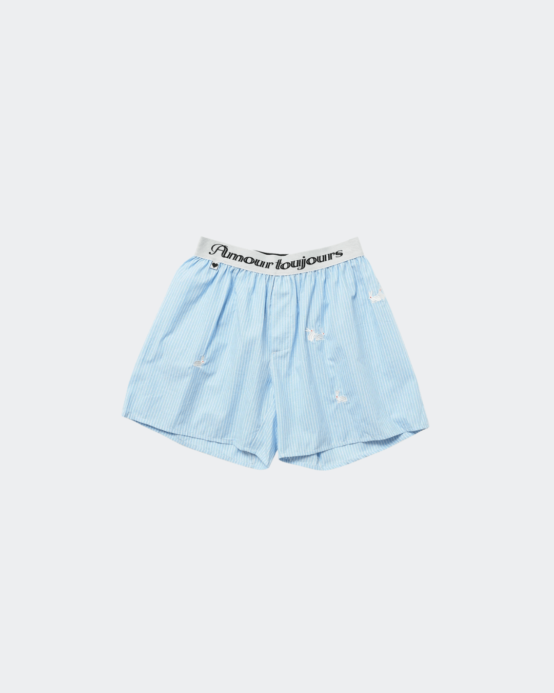 The Carne Bollente Follow The Rabbit in Blue Stripe brings the brand’s playful and provocative identity into a refined everyday essential. Designed as a classic boxer silhouette, it’s crafted from a soft cotton-elastane blend that ensures breathability, stretch, and all-day comfort. The clean blue stripe pattern is elevated with signature embroidered graphics placed throughout, while the elastic waistband features bold “Amour Toujours” typography for a distinctive branded touch. Blending classic elegance with tongue-in-cheek detailing, it’s a statement piece even in its most intimate form.