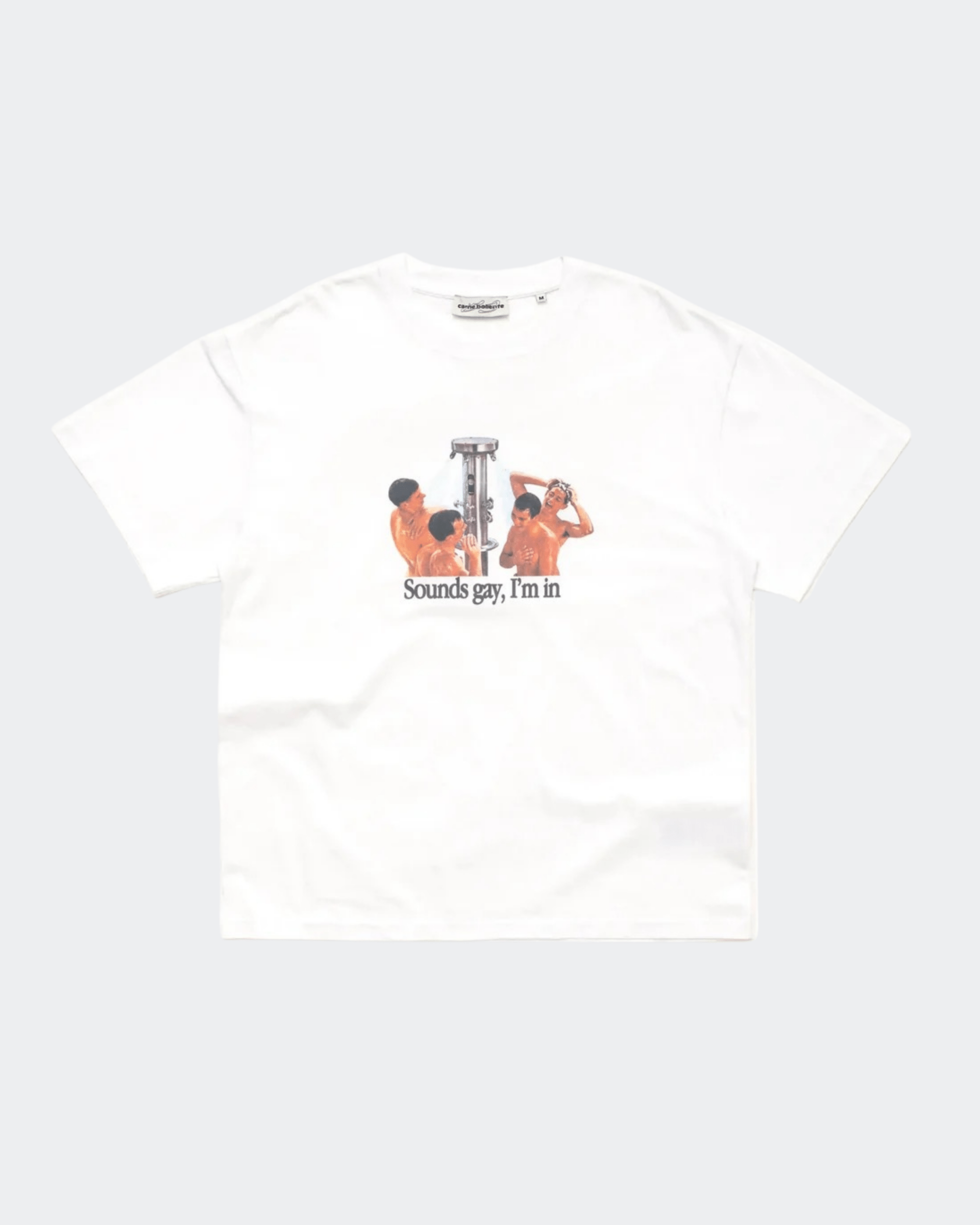 The Carne Bollente Sounds Gay, I’m In Tee White captures the brand’s unapologetic, playful energy through bold graphic expression. Known for blending humor, intimacy, and art, Carne Bollente turns everyday staples into confident statement pieces. The white base keeps it clean and versatile while the message brings unmistakable attitude.