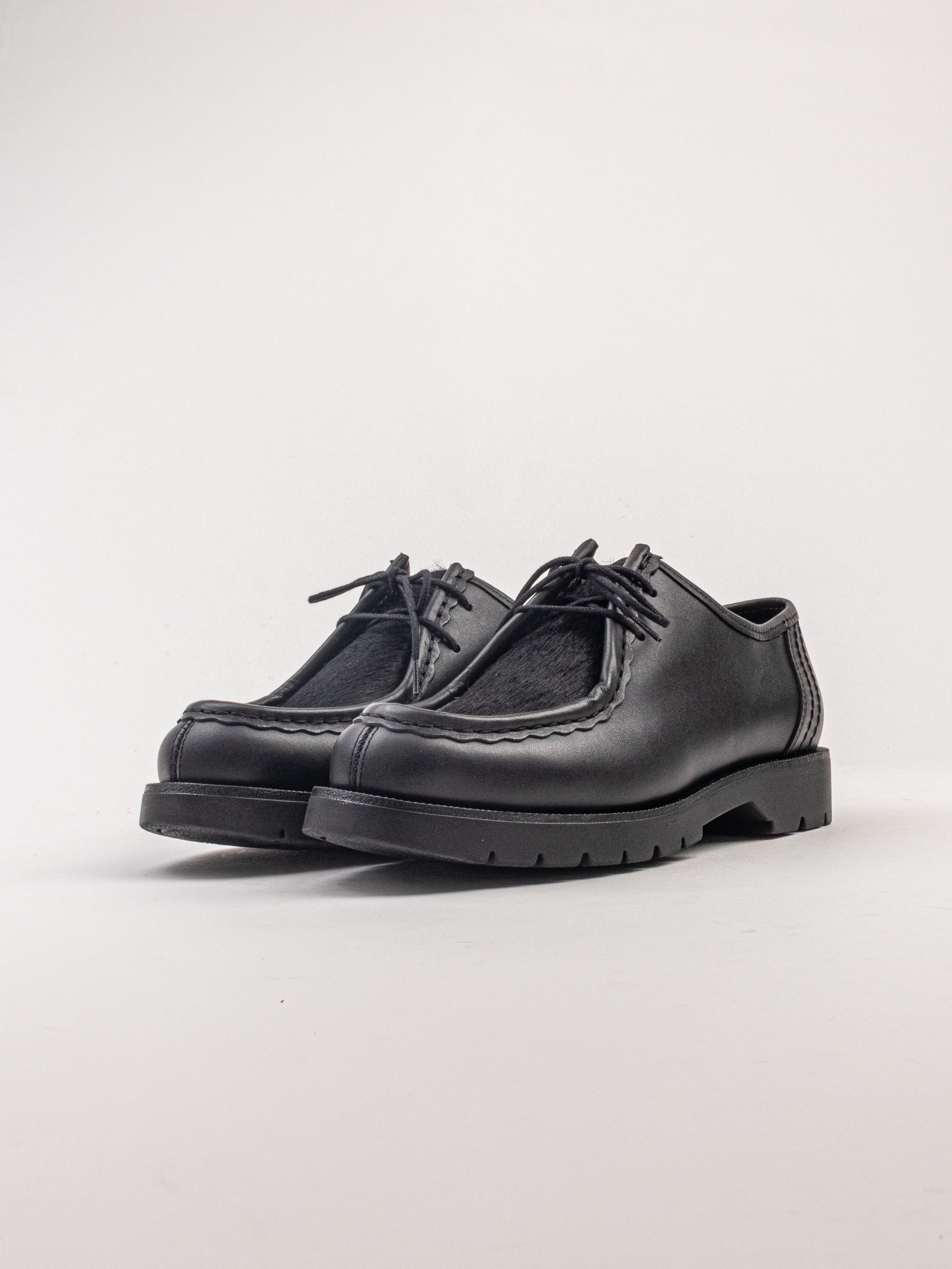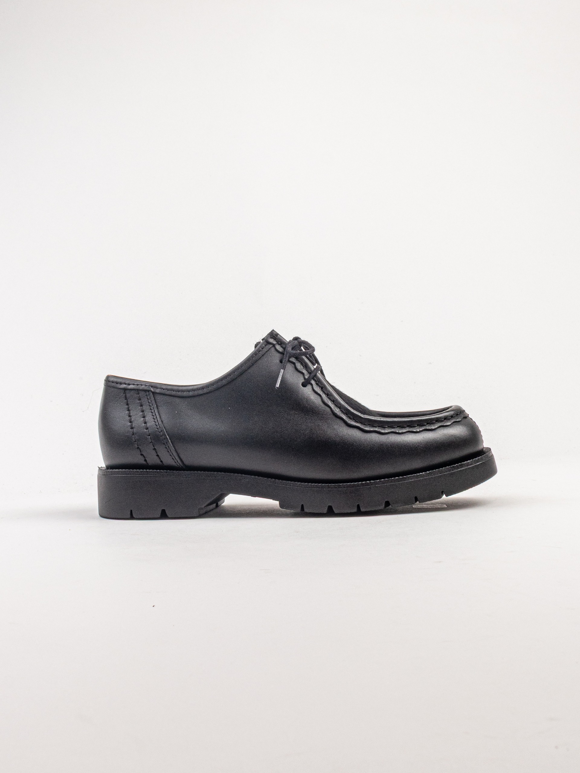 The Kleman Padrini in Black is a bold reinterpretation of classic French workwear footwear, blending rugged functionality with contemporary style. Crafted from premium cowhide leather, this derby silhouette features a distinctive chunky rubber outsole designed for anti-slip grip and long-lasting durability. The model stands out with its textured upper detailing and signature serrated sole edge, while maintaining a clean, versatile shape suitable for both casual and elevated looks. Made in France, it reflects Kleman’s heritage of producing robust, utilitarian footwear with modern appeal.